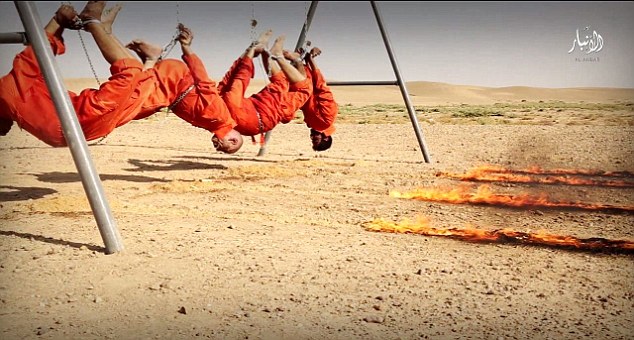 Αυτή τη φορά, σκέφτηκαν να βασανίσουν και το μυαλό εκτός από το σώμα τεσσάρων αιχμαλώτων τους, δένοντάς τους με αλυσίδες ανάποδα και αναγκάζοντάς τους να βλέπουν τις φλόγες να τους πλησιάζουν σιγά σιγά, μέχρι να καούν μαρτυρικά ζωντανοί.