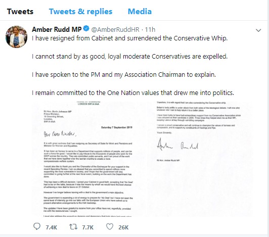 Νέο πλήγμα για τον Βρετανό πρωθυπουργό Μπόρις Τζόνσον. Αργά χθες το βράδυ παραιτήθηκε η υπουργός Εργασίας Άμπερ Ραντ, κατηγορώντας τον ότι διέπραξε μία «επίθεση στην αξιοπρέπεια και τη δημοκρατία» απομακρύνοντας τους 21 αντάρτες Συντηρητικούς βουλευτές, επειδή αψήφησαν την κομματική πειθαρχία και ψήφισαν υπέρ ενός νομοσχεδίου που αποτρέπει ένα Brexit χωρίς συμφωνία.