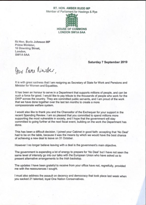 Στην επιστολή παραίτησής της προς τον Τζόνσον, η τέως υπουργός, η οποία είχε στηρίξει και ψηφίσει στο δημοψήφισμα του 2016 την παραμονή του Ηνωμένου Βασιλείου στην ΕΕ, ανέφερε: «Έγινα μέλος της κυβέρνησής σας με καλή πίστη. Αποδεχόμενη ότι ένα Brexit χωρίς συμφωνία έπρεπε να βρίσκεται στο τραπέζι, επειδή ήταν το μέσο με το οποίο θα είχαμε την καλύτερη ευκαιρία να πετύχουμε μια νέα συμφωνία αποχώρησης στις 31 Οκτωβρίου».