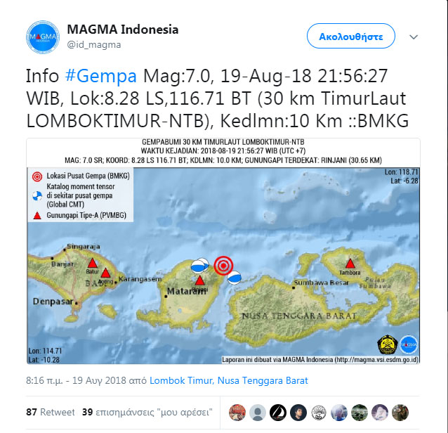 Νωρίτερα, το πρωί, στις 07:10 ώρα Ελλάδος, ένας ακόμη σεισμός μεγέθους 6,3 βαθμών της κλίμακας Ρίχτερ, ταρακούνησε ξανά το νησί Λόμποκ, μερικές εβδομάδες μετά τον ισχυρό σεισμό που προκάλεσε τον θάνατο περισσοτέρων από 430 ανθρώπων στην περιοχή αυτή.