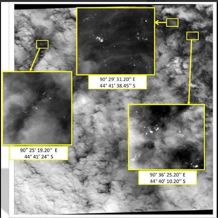 Νέες εικόνες από τα πιθανά συντρίμμια του χαμένο Boeing 777 της Malaysia Airlines δόθηκαν στην δημοσιότητα το πρωί της Τετάρτης μετά και την καθιερωμένη συνέντευξη τύπου δίνεται για την εξέλιξη των ερευνών. Στις φωτογραφίες που είναι τραβηγμένες από δορυφόρους διακρίνονται αντικείμενα που πιθανολογούνται ότι ανήκουν στο αεροπλάνο.
