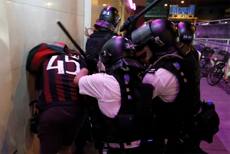 Τα επεισόδια ξέσπασαν όταν κάποιοι διαδηλωτές άρχισαν να πετούν κώνους σήμανσης, μπουκάλια και άλλα αντικείμενα προς τους αστυνομικούς στη διάρκεια της διαδήλωσης, η οποία είχε ξεκινήσει ειρηνικά, έγραψε η εφημερίδα South China Morning Post.