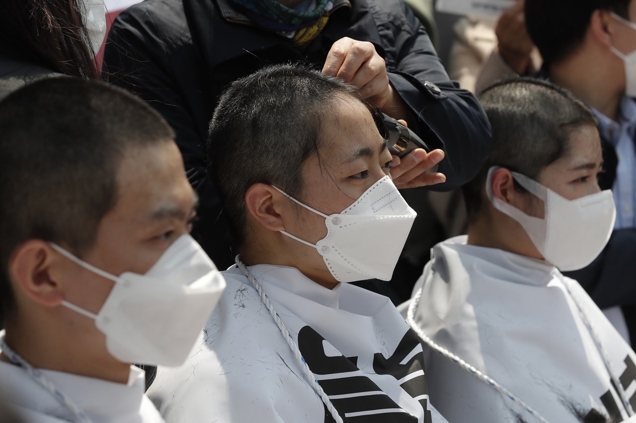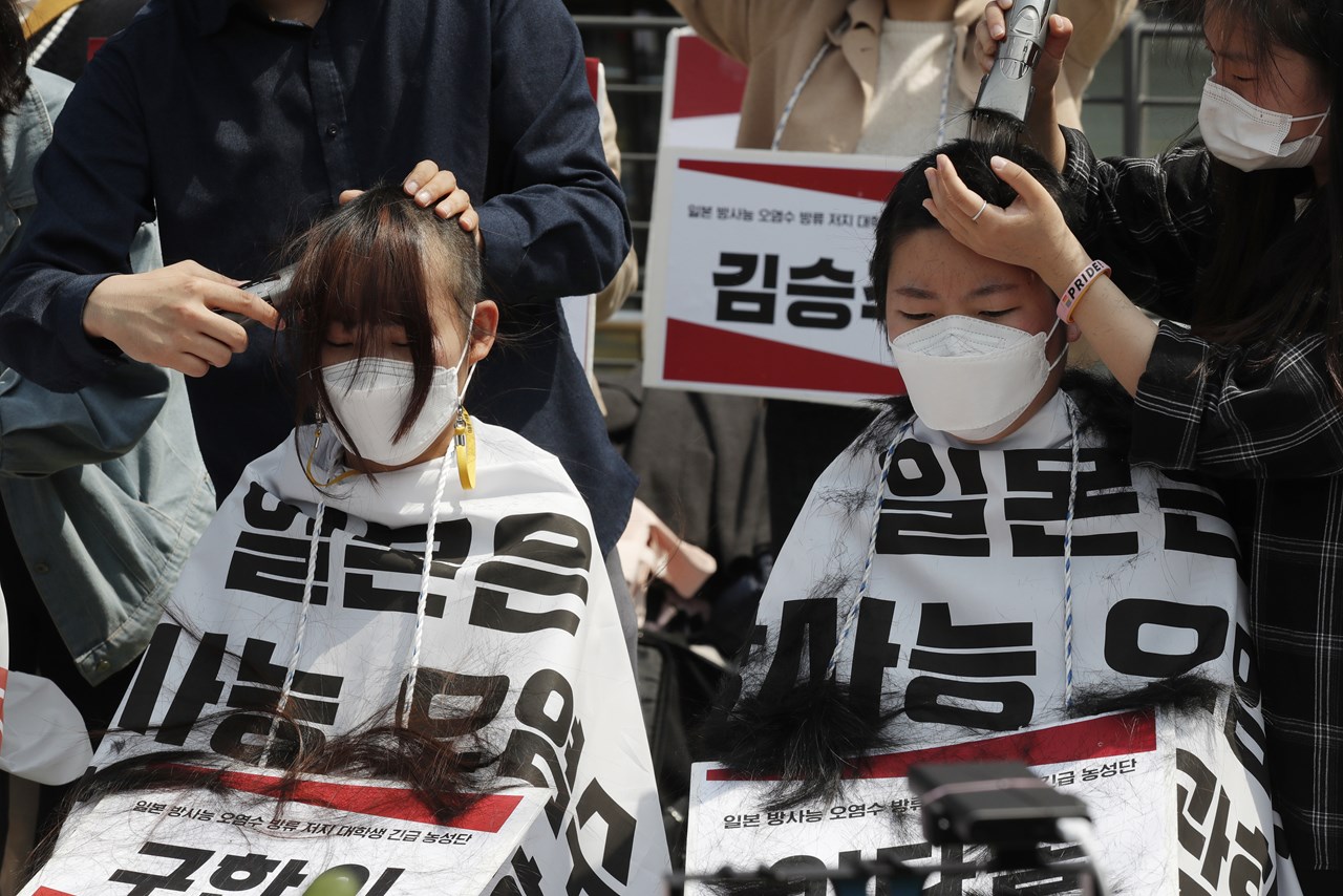 Περισσότεροι από 30 φοιτητές στη Νότια Κορέα ξύρισαν τα κεφάλια τους σήμερα, Τρίτη 20 Απριλίου, μπροστά στην ιαπωνική πρεσβεία στη Σεούλ σε διαμαρτυρία για το σχέδιο της Ιαπωνίας να απορρίψει στη θάλασσα νερό από τον πυρηνικό σταθμό της Φουκουσίμα.
