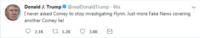 «Δεν ζήτησα ποτέ από τον Κόμεϊ να σταματήσει να ερευνά τον Φλιν. Άλλη μια πλαστή είδηση (Fake News), που καλύπτει άλλο ένα ψέμα του Κόμεϊ!», έγραψε ο Τραμπ στο Twitter.