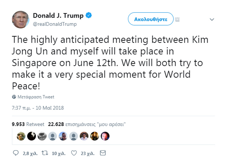 Ο Αμερικανός πρόεδρος Ντόναλντ Τραμπ δήλωσε με ανάρτησή του στο Twitter ότι θα συναντηθεί με τον Βορειοκορεάτη ηγέτη Κιμ Γιονγκ Ουν στις 12 Ιουνίου στη Σιγκαπούρη.