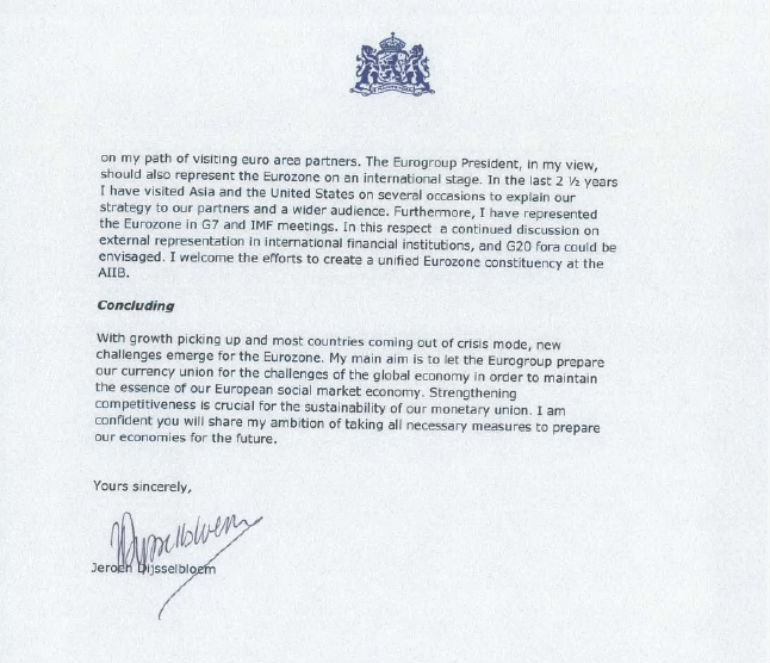 Αξίζει να σημειωθεί ότι από την επιστολή απουσιάζει οποιαδήποτε αναφορά στο «μαϊμού» – πτυχίο που αναφερόταν στο βιογραφικό του επικεφαλής του Eurogroup, το οποίο ουδέποτε απέκτησε.