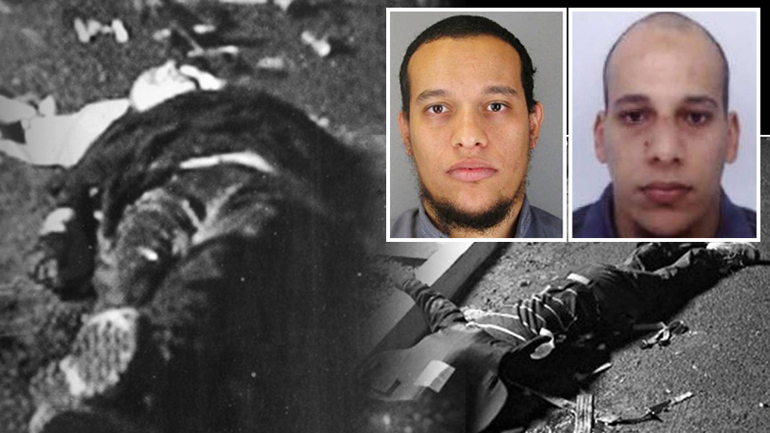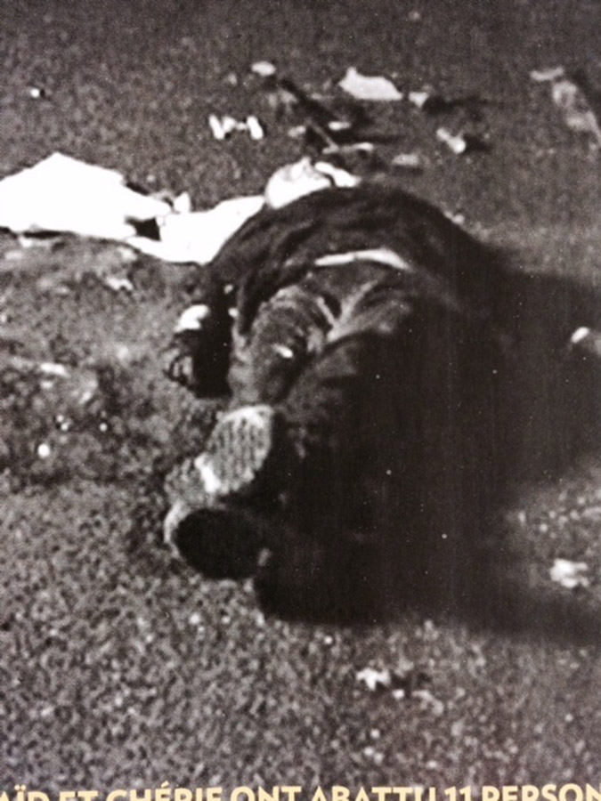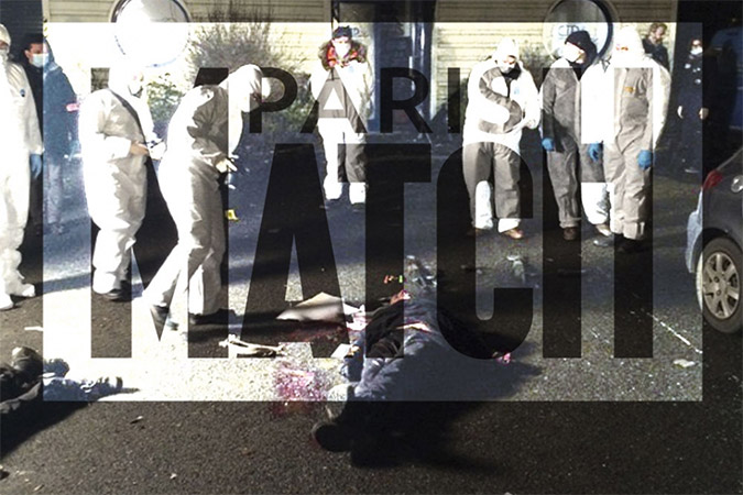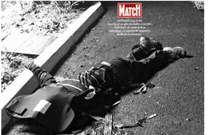 Φωτογραφίες-ντοκουμέντο των δύο δραστών που αιματοκύλησαν τα γραφεία της σατιρικής εφημερίδας «Charlie Hebdo» να κείτονται νεκροί δημοσιεύτηκαν την Πέμπτη στην έντυπη έκδοση του γαλλικού περιοδικού «Paris Match».