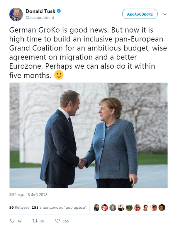 Ο πρόεδρος του Ευρωπαϊκού Συμβουλίου Ντόναλντ Τουσκ χαιρέτισε σήμερα τον σχηματισμό ενός νέου κυβερνητικού συνασπισμού υπό την καγκελάριο Άγγελα Μέρκελ στη Γερμανία, λέγοντας ότι πρόκειται για μια «καλή είδηση».