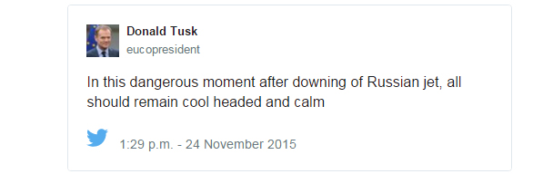 Ο πρόεδρος του Ευρωπαϊκού Συμβουλίου Ντόναλντ Τουσκ, πληροφορηθείς το «πολεμικό επεισόδιο» της κατάρριψης ρωσικού μαχητικού από τουρκικά έσπευσε να κάνει δηλώσεις στις οποίες κάλεσε τις εμπλεκόμενες πλευρές να «διατηρήσουν την ψυχραιμία τους»