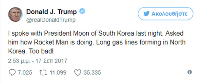 Σε συνομιλία με τον πρόεδρο της Νότιας Κορέας, ο Ντόναλντ Τραμπ τον ρώτησε τι κάνει ο μεγάλος εχθρός του, αναφερόμενος στον Κιμ Γιόνγκ Ούν, αποκαλώντας τον «Rocket Man» δηλαδή «άνθρωπο – πύραυλο», επιλέγοντας ένα ψευδώνυμο για να χαρακτηρίσει τον άνθρωπο που έχει αναστατώσει τον πλανήτη με τις απειλές του.