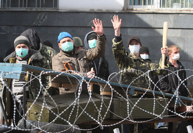 Φιλορώσοι διαδηλωτές με καλυμμένα τα πρόσωπα κατέλαβαν κυβερνητικά κτίρια σε τρεις συνολικά πόλεις, επιθυμώντας να δημιουργήσουν κλίμα αντίστοιχο με εκείνο στην Κριμαία.