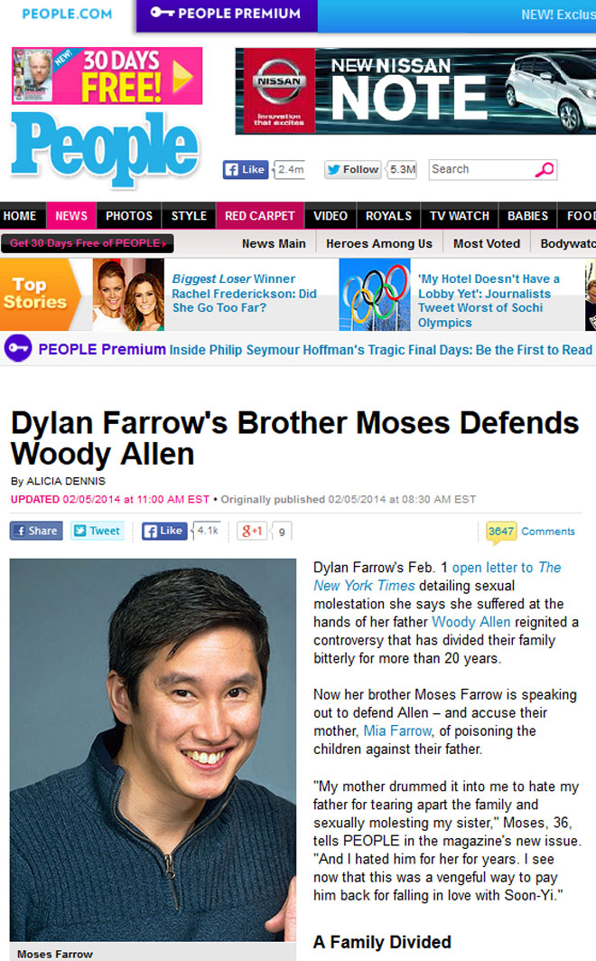 Σήμερα, ο 36χρονος πλέον Μόζες Φάροου παραχώρησε μία μακροσκελή συνέντευξη στο αμερικανικό People στην οποία παίρνει ανοικτά θέση υπέρ του Άλεν, τονίζοντας ότι η ηθοποιός από τότε που ο Άλεν την άφησε και προχώρησε σε σχέση με την κόρη που είχε εκείνη υιοθετήσει με τον Άλεξ Πρέβιν, Σουν-Γι, έκανε τα πάντα για να εμφυτεύσει ψευδείς αναμνήσεις στο μυαλό της Ντίλαν.