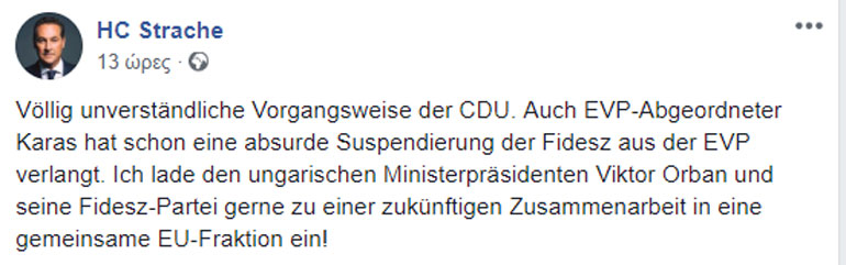 «Προσκαλώ με ιδιαίτερη ικανοποίηση τον Ούγγρο πρωθυπουργό, Βίκτορ Όρμπαν και το κόμμα του να εργαστούμε μαζί για το μέλλον σε μια κοινή πολιτική ομάδα της ΕΕ!», δήλωσε ο Στράχε σε ανάρτησή του στο Facebook.
