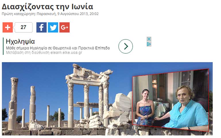 «Για όσους αγαπούν την Ιστορία και την Αρχαιολογία και θέλουν να ανακαλύψουν τον ασύλληπτο αρχαιολογικό πλούτο των Μικρασιατικών παραλίων. Με αφετηρία η Σμύρνη, επισκέφτηκα πάνω από είκοσι αρχαιολογικούς χώρους, με πιο γνωστούς την Έφεσο και την Πέργαμο, καταλήγοντας στην Αττάλεια.