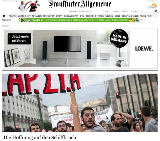 Η εφημερίδα της Φραγκφούρτης εκτιμά στις οικονομικές της σελίδες ότι «ένα Grexit γίνεται πιθανότερο», επισημαίνοντας ότι «μία ελεγχόμενη έξοδος από το ευρώ είναι δύσκολη». Σε σχόλιό της -και πάλι στις οικονομικές της σελίδες- θεωρεί καθυστερημένη την απόφαση επιβολής περιορισμών στην κίνηση κεφαλαίων στην Ελλάδα.
