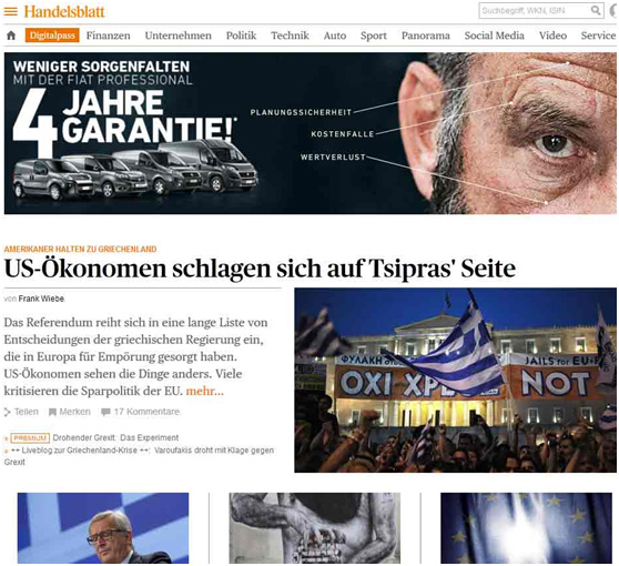 Η οικονομική εφημερίδα Handelsblatt επιρρίπτει ανεύθυνους χειρισμούς στον Αλέξη Τσίπρα, επισημαίνοντας ότι «από το Σαββατοκύριακο έχει κανείς την εντύπωση ότι πότε δεν επιδίωκε πραγματικά να διαπραγματευτεί έναν αποδεκτό συμβιβασμό, αλλά να αφήσει στοχευμένα τις διαπραγματεύσεις να αποτύχουν».