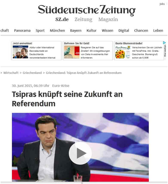 Σε ό,τι αφορά το επικείμενο δημοψήφισμα η SZ επισημαίνει ότι «αποτελεί αναφαίρετη επιλογή της κυβέρνησης του ΣΥΡΙΖΑ να ρωτήσει τους Έλληνες αν θέλουν να την ακολουθήσουν. Ωστόσο, το κάνει στο “παρά δύο”, με αποτέλεσμα να φαίνεται σαν τέχνασμα».