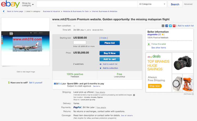 Δημοσιογράφος από την Κύπρο αγόρασε το domain name mh370.com λίγο μετά την εξαφάνιση του αεροπλάνου της Malaysia Airlines, προκαλώντας αντιδράσεις τόσο από συναδέλφους του όσο και από συγγενείς των επιβαινόντων στο μοιραίο Boeing, οι οποίοι θεωρούν απαράδεκτη την κίνησή του να προσπαθήσει να βγάλει λεφτά από μια τέτοια τραγική στιγμή.