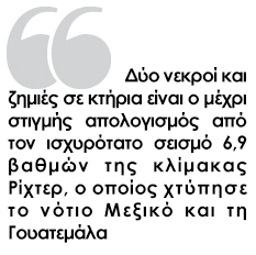 Σεισμική δόνηση 6,9 βαθμών της κλίμακας Ρίχτερ συγκλόνισε στις 14.23 ώρα Ελλάδος το Μεξικό, κοντά στα σύνορα με τη Γουατεμάλα. Ο σεισμός είχε ως αποτέλεσμα να σημειωθούν μεγάλες υλικές ζημιές, ενώ οι πρώτες πληροφορίες κάνουν λόγο για δύο νεκρούς.