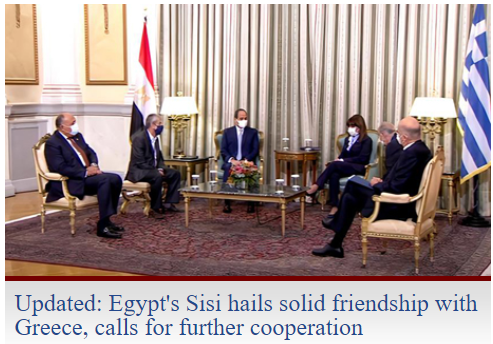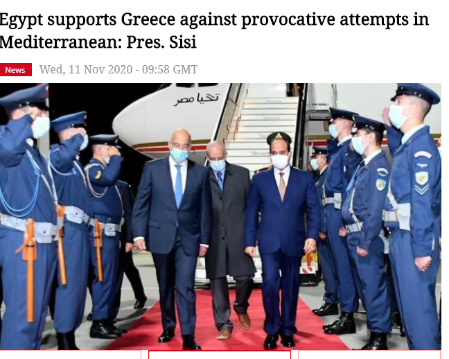 - Η “Egypt Today” τιτλοφορεί τη δήλωση του Αιγυπτίου Προέδρου Αλ Σίσι «Η Αίγυπτος υποστηρίζει την Ελλάδα ενάντια σε προκλητικές προσπάθειες στη Μεσόγειο».