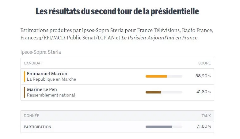 H BFM TV έδινε 57,6% στον Μακρόν και 42,6 στη Λεπέν. Η δημόσια τηλεόραση Α2 ανέφερε πως ο Μακρόν επικράτησε με 58,2%.