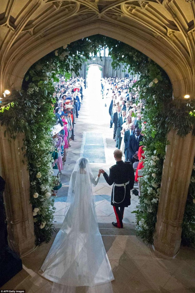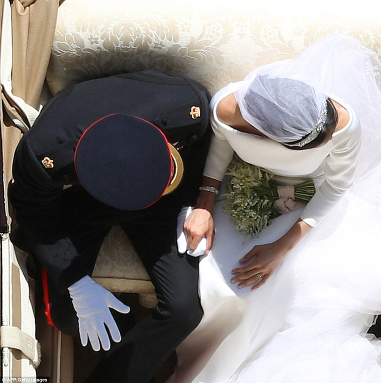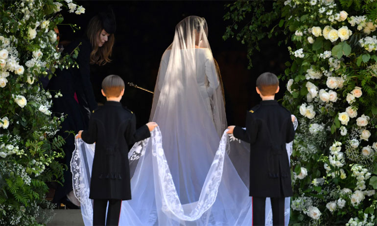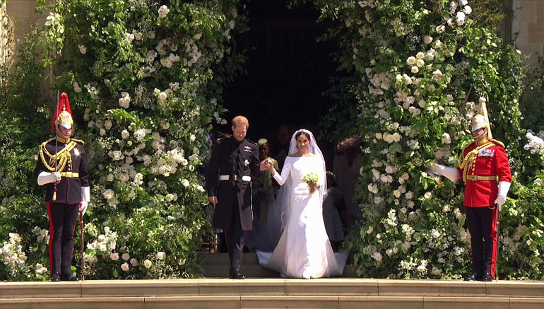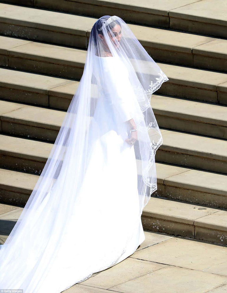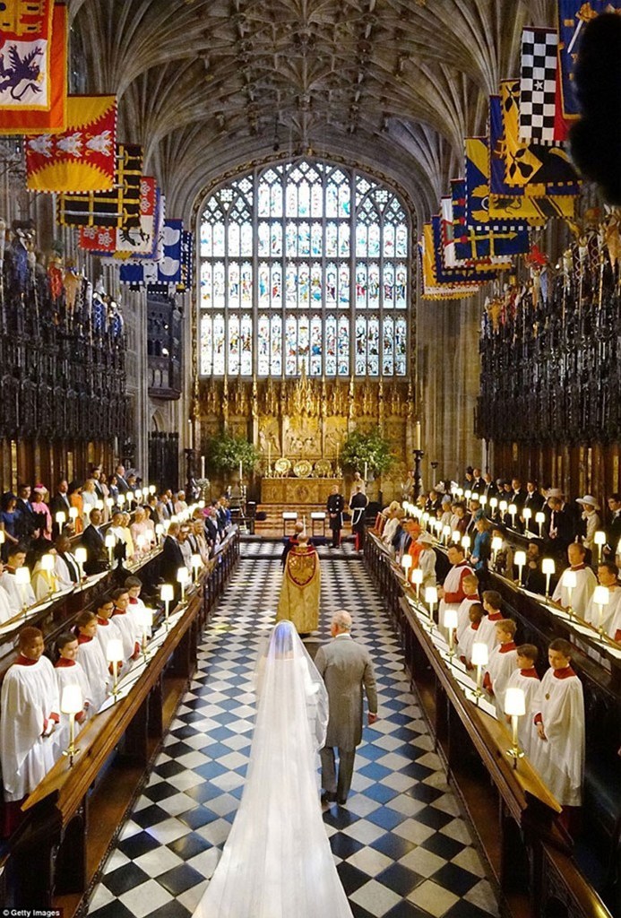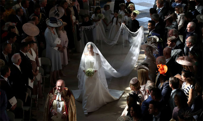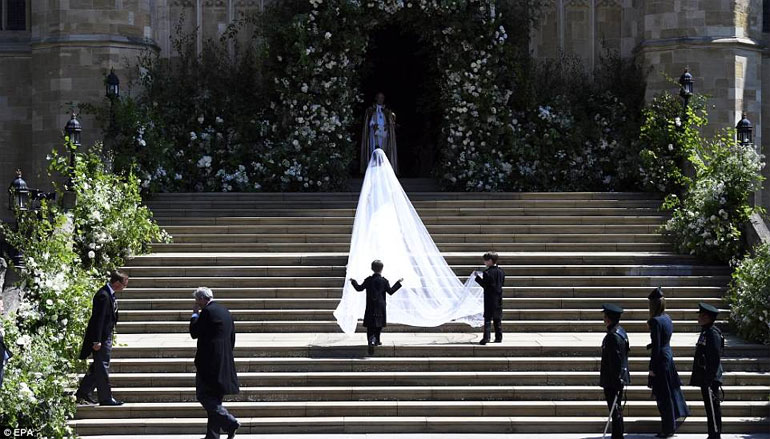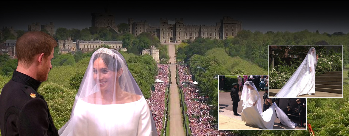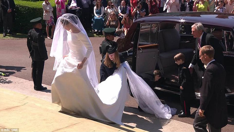 Στις 14.00 (ώρα Ελλάδος) η Aμερικανίδα ηθοποιός Μέγκαν Μαρκλ ανέβηκε τα σκαλοπάτια του Αγίου Γεωργίου φορώντας ένα εντυπωσιακό νυφικό με μακριά ουρά και πέπλο που έφερε την υπογραφή του οίκου Givenchy. H μητέρα της εμφανώς συγκινημένη, κατά τη διάρκεια όχι μόνο της τελετής, συνόδευε την κόρη της με το αυτοκίνητο λίγο πριν μπει στο πλημμυρισμένο από λουλούδια παρεκκλήσι του Αγίου Γεωργίου.