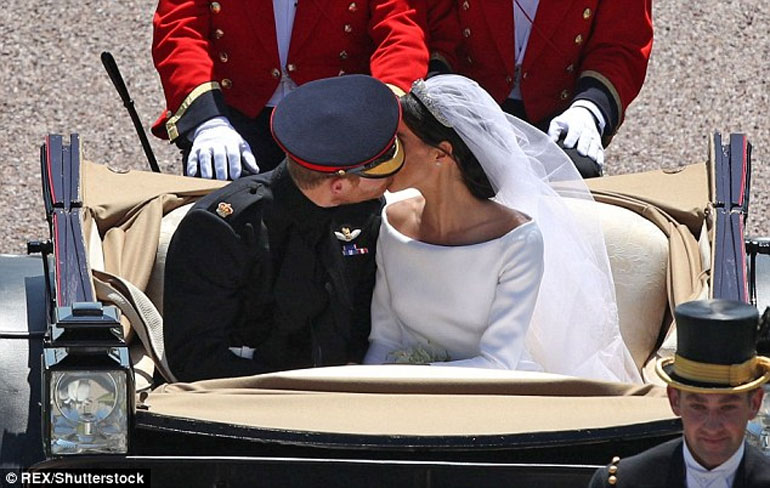 Οι νεόνυμφοι βγήκαν από την εκκλησία με τη χαρά ζωγραφισμένη στο πρόσωπό τους, κρατώντας ο ένας το χέρι του άλλου, ο Χάρι και η Μέγκαν έδωσαν το πολυαναμενόμενο φιλί στα σκαλοπάτια του Αγίου Γεωργίου, με τα φλας των φωτογράφων να πέφτουν βροχή.