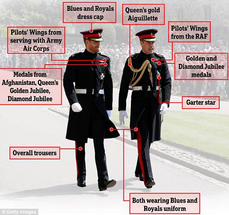Ο Χάρι φορούσε στολή την οποία στόλιζαν στο στήθος ένα διακριτικό της πολεμικής αεροπορίας -που έλαβε ο πρίγκιπας όταν ήταν πιλότος ελικοπτέρων Apache στον στρατό- και ένα μετάλλιο που θυμίζει τη θητεία του στο Αφγανιστάν.