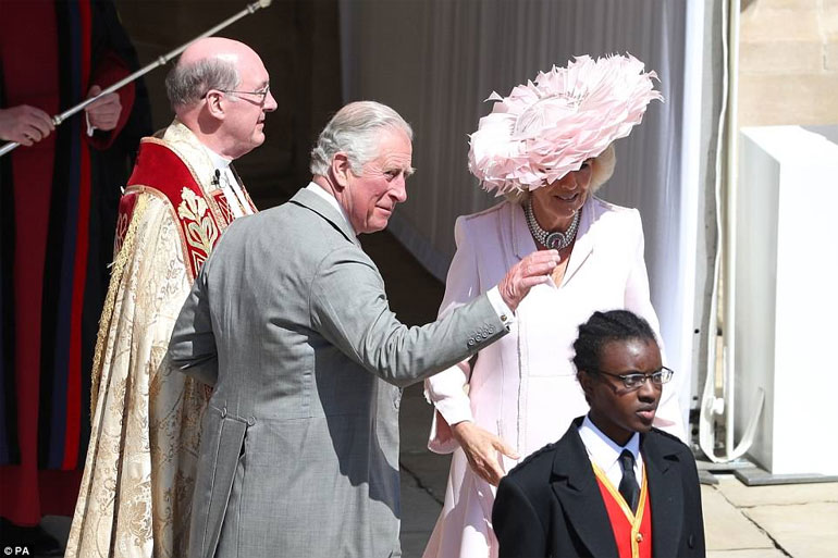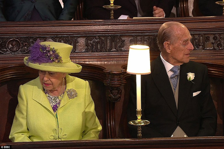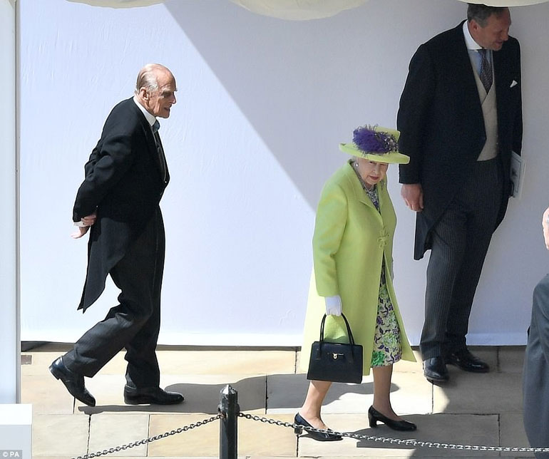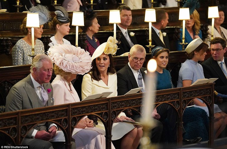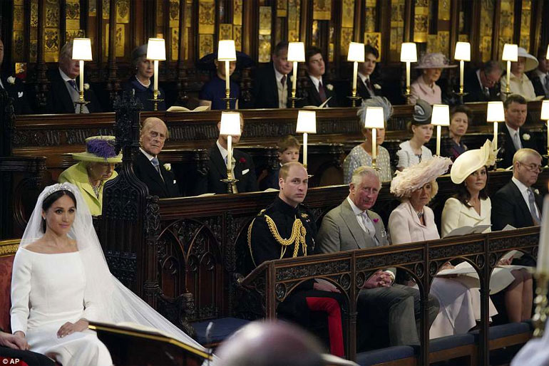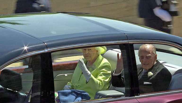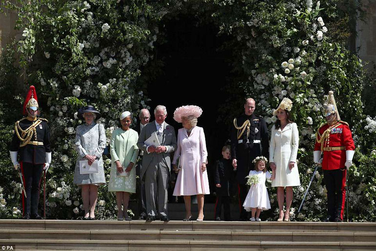 Η βασίλισσα Ελισάβετ Β’ με τον σύζυγό της πρίγκιπα Φίλιππο έφτασαν στις 13.55 (ώρα Ελλάδος) στο παρεκκλήσι του Αγίου Γεωργίου, πέντε λεπτά πριν από την άφιξη της νύφης και οι τελευταίοι από τα μέλη της βασιλικής οικογένειας που κατέφθασαν στον Ναό. Είχε προηγηθεί η άφιξη του πατέρα του γαμπρού, του πρίγκιπα της Ουαλίας Κάρολου και της δούκισσας της Κορνουάλης Καμίλα.