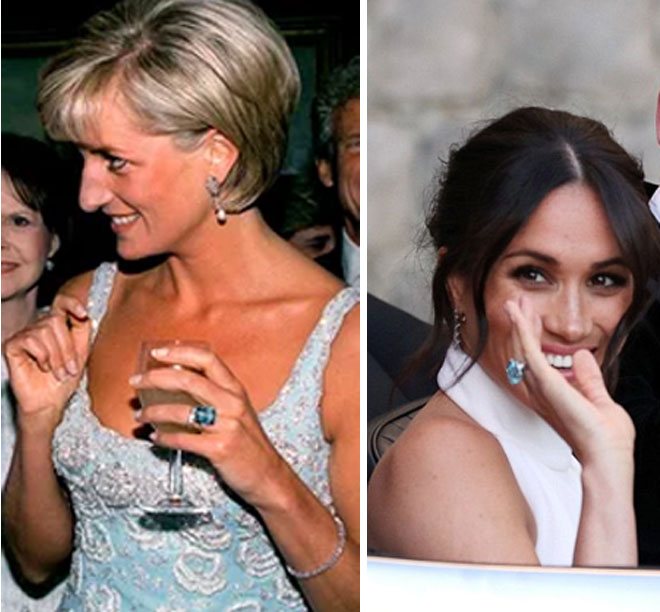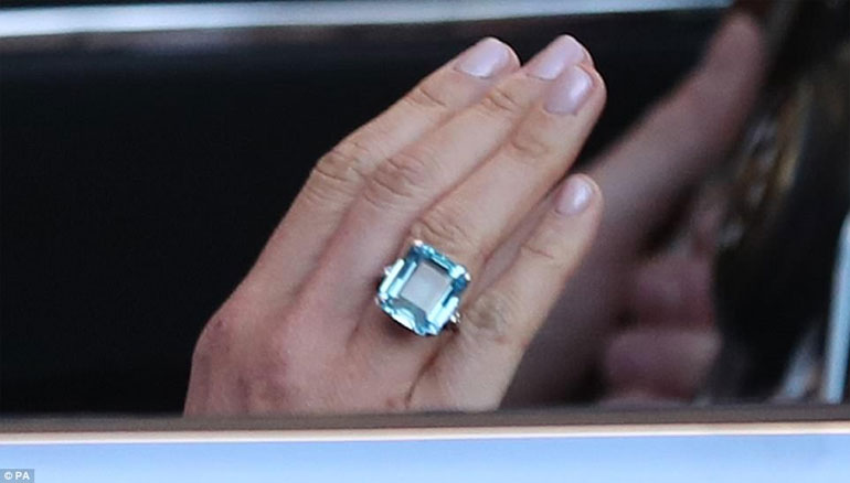 Συγκινησιακά φορτισμένη ήταν η στιγμή που ο Χάρι έδωσε στη Μέγκαν το σμαραγδένιο δαχτυλίδι με τον πολύτιμο λίθο, ακουαμαρίνα (aquamrine) που φορούσε η πριγκίπισσα Νταϊάνα. Τα φλας των φωτογράφων έλαμψαν όταν η νύφη χαιρέτησε τους παρευρισκόμενους και αποκαλύφθηκε το εντυπωσιακό μονόπετρο με τις λαμπερές μπλε αποχρώσεις του.