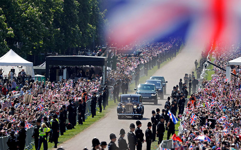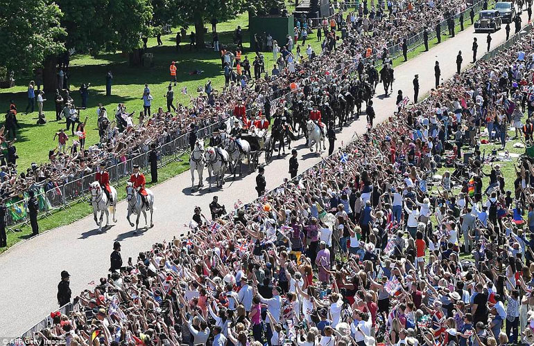 Πέντε λεπτά μετά τις 15.00 το μεσημέρι ο δούκας και η δούκισσα του Σάσεξ αποχώρησαν με άμαξα από το παρεκκλήσι, το οποίο ήταν στολισμένο εντός και εκτός με λευκά λουλούδια, και διέσχισαν για 25 λεπτά τους δρόμους του Ουίνσδορ.Στη συνέχεια το ζευγάρι επέστρεψε στο κάστρο του Ουίνδσορ όπου πραγματοποιήθηκε η πρώτη γαμήλια δεξίωση.