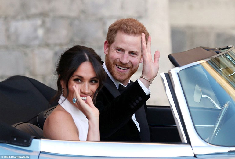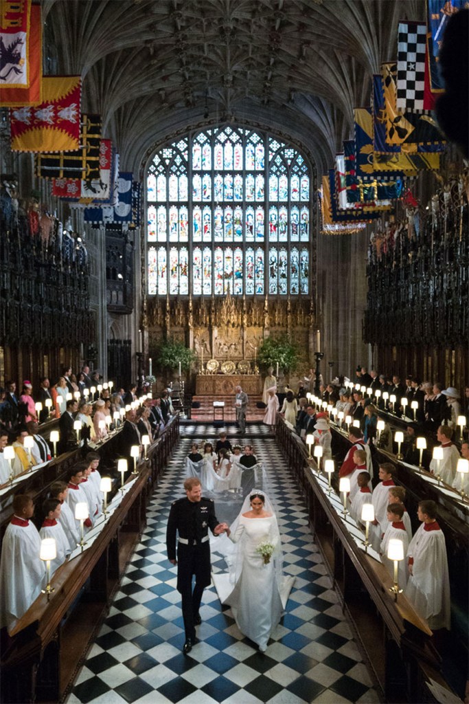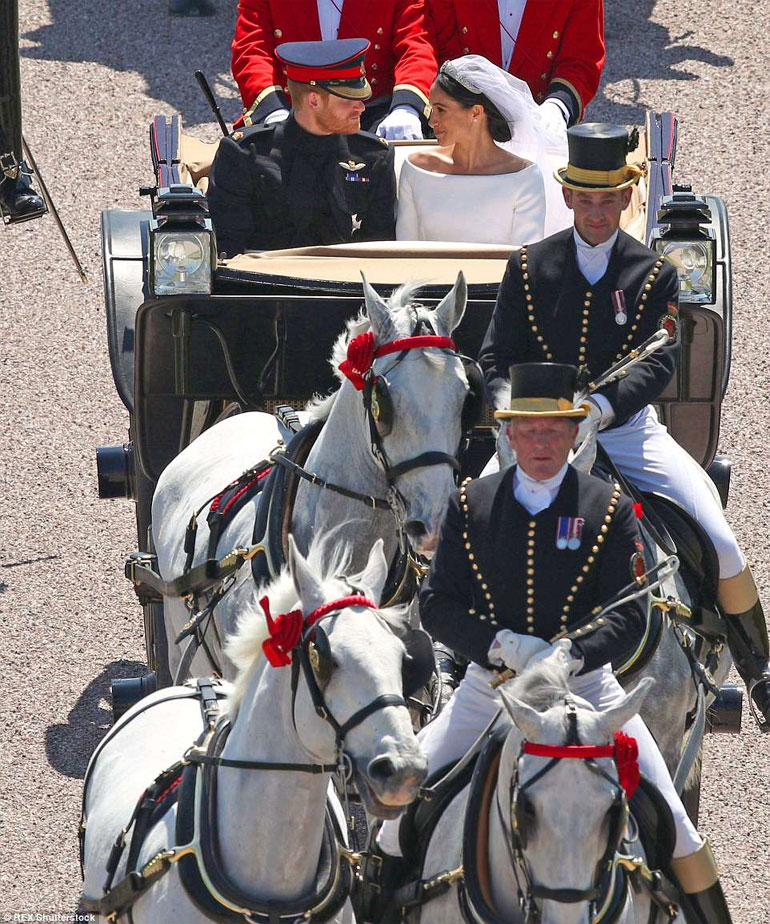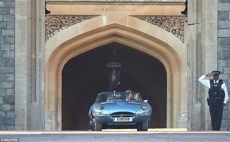 Η δούκισσα του Σάσεξ φορώντας μια κατάλευκη τουαλέτα που έφερε την υπογραφή της Stella McCartney και ένα ζευγάρι γαλάζιες γόβες Aquazurra, δεν σταματούσε να χαμογελά, ενώ ο δούκας του Σάσεξ ντυμένος με σμόκιν κοστούμι συνόδευε τη σύζυγό του Μέγκαν έχοντας επιβιβαστεί σε μία κάμπριο Jaguar E-Type Concept Zero με κατεύθυνση την κατοικία του πρίγκιπα Καρόλου.