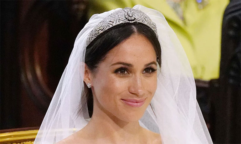 Η Μέγκαν φορούσε παπούτσια επίσης του γαλλικού οίκου Givenchy και ένα διαμαντένιο διάδημα του 1932 που της δάνεισε η βασίλισσα Ελίζαμπεθ Β’, η γιαγιά του Χάρι. Τα σκουλαρίκια και το βραχιόλι της ήταν του οίκου Cartier.