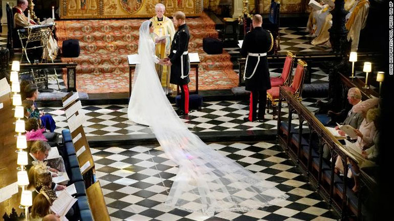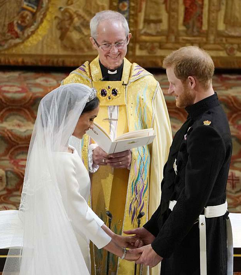 Αφού αντάλλαξαν υποσχέσεις αγάπης και αφοσίωσης «έως το θάνατο», ο 33χρονος Χάρι, έκτος κατά σειρά διάδοχος του βρετανικού θρόνου πέρασε το χρυσό δακτυλίδι στο χέρι της Μέγκαν και εκείνη έκανε το ίδιο στον Χάρι. Νωρίτερα, το ζευγάρι απάντησε στον αρχιεπίσκοπο ότι δέχεται ένας τον άλλον ως σύζυγο, ακολουθώντας την παράδοση, σε μια θρησκευτική τελετή πολύ συγκινητική στο παρεκκλήσι του Αγίου Γεωργίου στο Ουίνδσορ, ενώπιον 600 καλεσμένων εκ των οποίων η βασίλισσα Ελισάβετ και πλήθος διασημοτήτων.