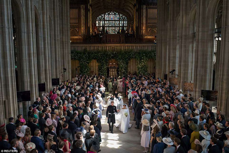 Η νύφη, όπως ήταν προγραμματισμένο, τα πρώτα μέτρα του διαδρόμου εντός της εκκλησίας τα διένυσε μόνη της και στο δεύτερο μισό της διαδρομής συναντήθηκε με τον πρίγκιπα Κάρολο, ο οποίος την παρέδωσε στον πρίγκιπα Χάρι.