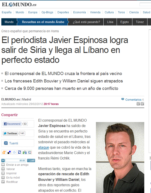 Ο ανταποκριτής της «El Mundo», ο οποίος επιβίωσε από τον βομβαρδισμό που στοίχισε τη ζωή στην Αμερικανίδα δημοσιογράφο Μαρί Κόλβιν και τον Γάλλο φωτογράφο Ρεμί Οσλίκ στην πόλη Χομς, «βγήκε από τη Συρία και βρίσκεται στο Λίβανο και η κατάσταση της υγείας του είναι άριστη», προσθέτει η εφημερίδα.