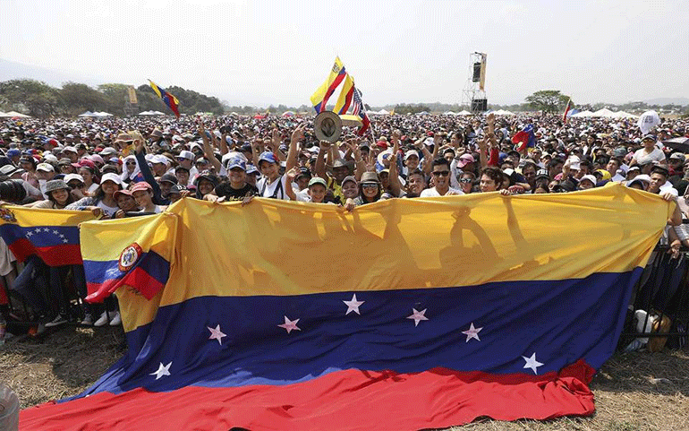 Στα σύνορα Κολομβίας – Βενεζουέλας και στην πόλη Κούκουτα διεξάγεται γιγαντιαία συναυλία με τη συμμετοχή 32 καλλιτεχνών με αίτημα να επιτραπεί στην ανθρωπιστική βοήθεια να περάσει στη χώρα του Μαδούρο. Λίγα χιλιόμετρα από εκεί, στο έδαφος της Βενεζουέλας και σχεδόν πάνω στη συνοριακή γραμμή διοργανώνεται μία δεύτερη συναυλία υπέρ του Μαδούρο.