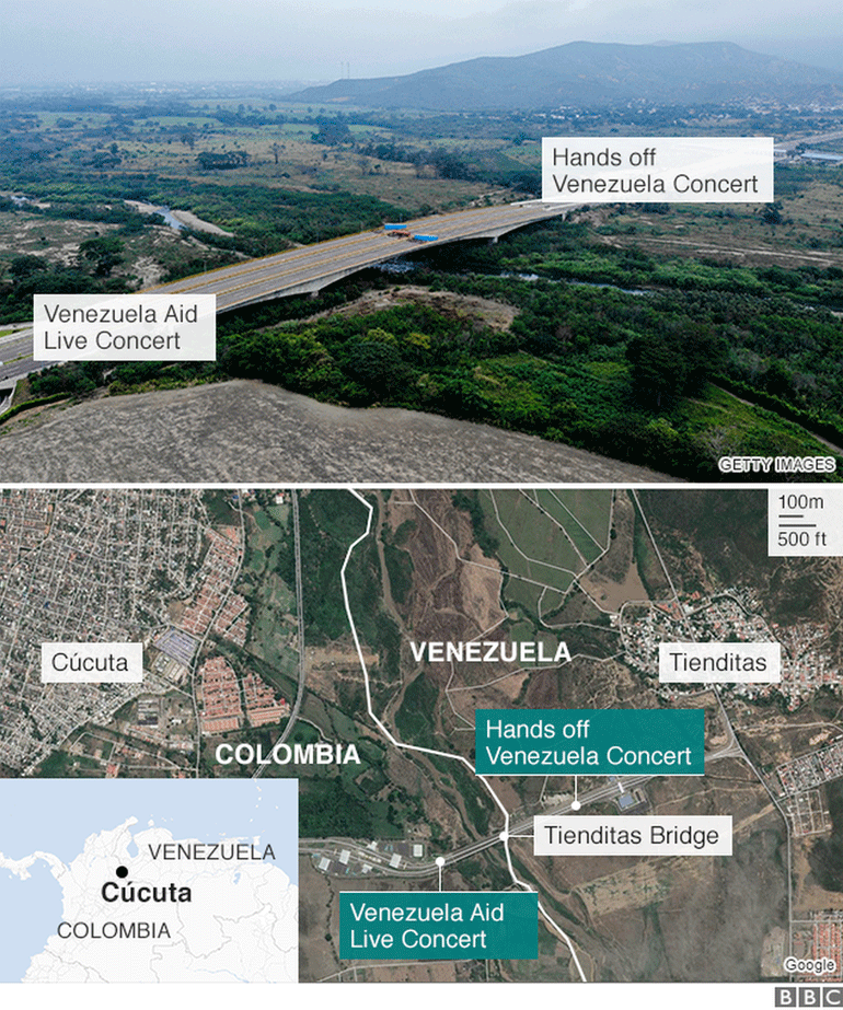 Στα σύνορα Κολομβίας – Βενεζουέλας και στην πόλη Κούκουτα διεξάγεται γιγαντιαία συναυλία με τη συμμετοχή 32 καλλιτεχνών με αίτημα να επιτραπεί στην ανθρωπιστική βοήθεια να περάσει στη χώρα του Μαδούρο. Λίγα χιλιόμετρα από εκεί, στο έδαφος της Βενεζουέλας και σχεδόν πάνω στη συνοριακή γραμμή διοργανώνεται μία δεύτερη συναυλία υπέρ του Μαδούρο.