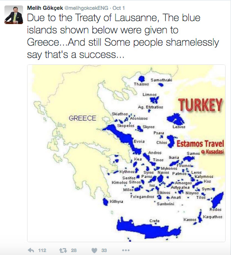 Ο ίδιος σχολίασε: «Εξαιτίας της Συνθήκης της Λωζάννης τα μπλε νησιά που φαίνονται παρακάτω δόθηκαν στην Ελλάδα… Μην ξεχνάτε πως κάποιοι χαρακτηρίζουν τη Λωζάννη νίκη…».