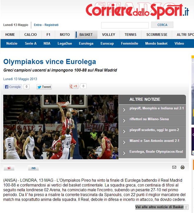 Corriere dello sport: Ιστορικός Ολυμπιακός, σπουδαίος Σπανούλης. Οι “ερυθρόλευκοι” ανέτρεψαν τον τελικό με τη Ρεάλ όπως και πέρυσι τον αντίστοιχο με την ΤΣΣΚΑ