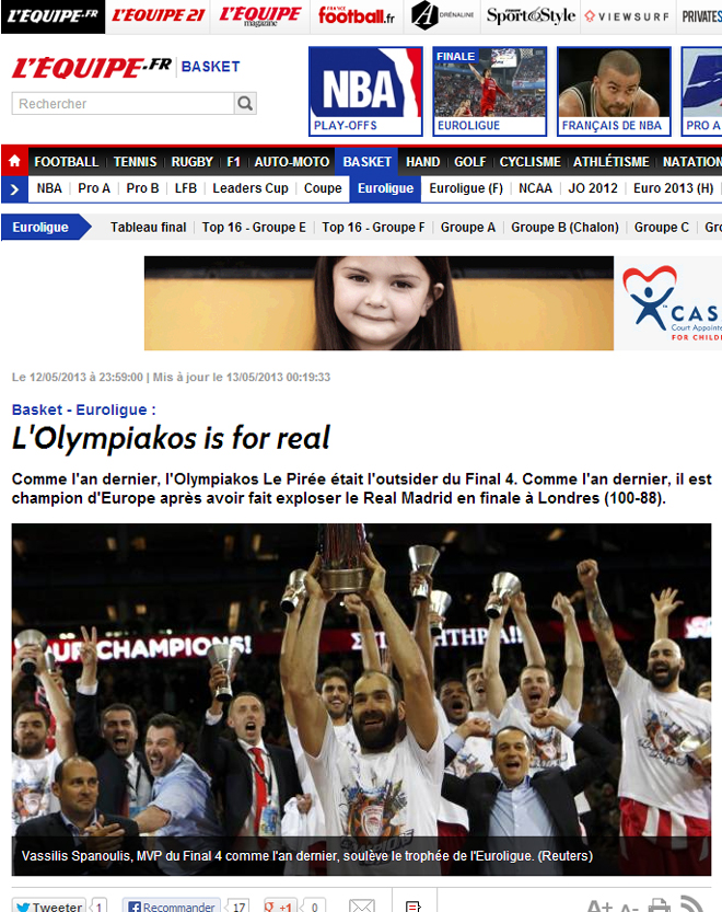 L’ equipe: Ο Ολυμπιακός ήταν αληθινός. Οπως και πέρυσι η ελληνική ομάδα ήταν το αουτσάιντερ του φάιναλ φορ και όμως κατάφερε να επικρατήσει. Στον τελικό της Κυριακής ο Ολυμπιακός ήταν εκρηκτικός στα τρία τελευταία δεκάλεπτα.