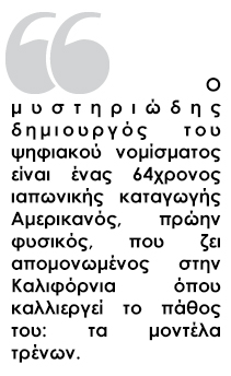 Στον ιστότοπό του υποστήριξε πως ο μυστηριώδης δημιουργός του ψηφιακού νομίσματος είναι ένας 64χρονος ιαπωνικής καταγωγής Αμερικανός, πρώην φυσικός, που ζει απομονωμένος στην Καλιφόρνια, όπου καλλιεργεί το πάθος του: τα μοντέλα τρένων.