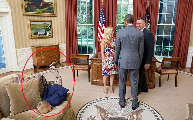Ο μικρός αποφασίζει να κάνει μία «βουτιά» στον πολυτελή καναπέ του γραφείου αγνοώντας τις συμβουλές των γονιών του να φερθεί… κόσμια μπροστά στον πρόεδρο.