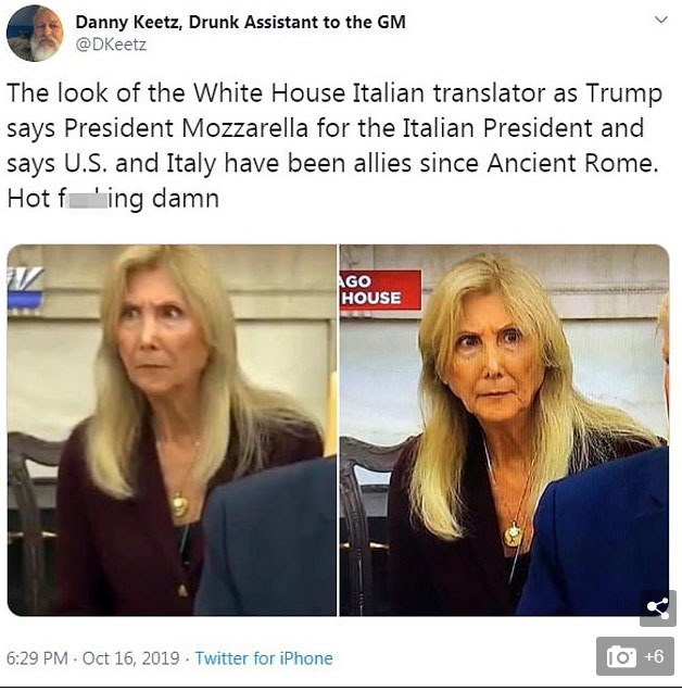 Κατά τη διάρκεια κοινής συνέντευξης Τύπου αποκάλεσε πολλάκις τον πρόεδρο της Ιταλίας, Μοτσαρέλα αντί του Ματαρέλα που είναι το όνομα του ιταλού πολιτικού. Προφανώς η ονομασία του  ιταλικού  τυριού  είναι και η μόνη ιταλική λέξη που γνωρίζει απέξω ο πρόεδρος των ΗΠΑ. Ενδεχομένως να γνωρίζει και την λέξη Πίτσα ή Μαφία. Μέχρις εκεί. Το ζήτημα είναι πώς οι γκάφες του Τραμπ προκάλεσαν τις αντιδράσεις της επίσημης μεταφράστριας του Λευκού Οίκου η οποία ομολογουμένως αξίζει να λάβει το Όσκαρ υπομονής, αντοχής και ανοχής.