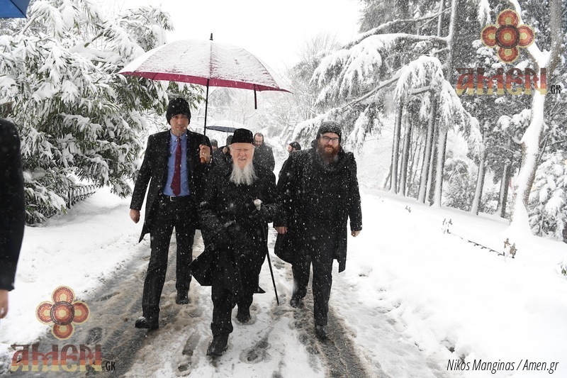 Ο Πατριάρχης Βαρθολομαίος περπάτησε στους χιονισμένους δρόμους της Πόλης, κάτω από συνθήκες έντονης χιονόπτωσης.