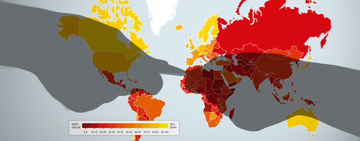 Η έκθεση της Διεθνούς Διαφάνειας για το 2014 ταξινομεί 175 χώρες σε μια κλίμακα μονάδων από το 0 έως το 100, αρχίζοντας από την πιο διεφθαρμένη και καταλήγοντας στην πιο αδιάφθορη. Η Ελλάδα είναι στην 69 θέση (43 μονάδες), μαζί με τη Βραζιλία, τη Bουλγαρία, την Ιταλία, τη Ρουμανία, τη Σενεγάλη και τη Σουαζιλάνδη.
