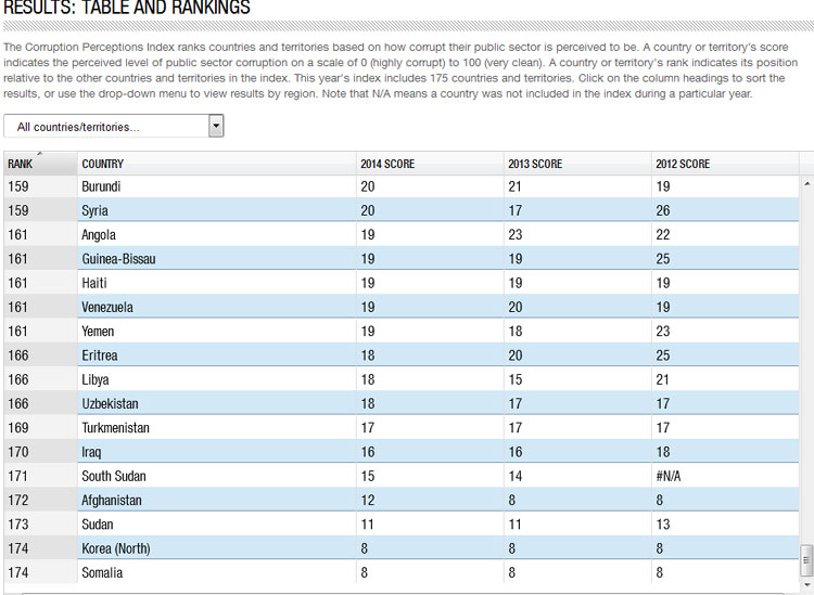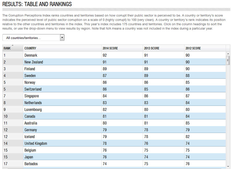 Ακολουθεί μια γενική επισκόπηση της κατάταξης για το 2014 με τις πιο αδιάφθορες ή τις πιο διεφθαρμένες χώρες, σύμφωνα με τη Διεθνή Διαφάνεια: