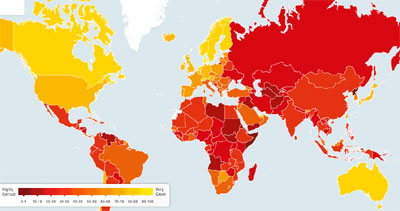 Ακολουθεί μια γενική επισκόπηση της κατάταξης για το 2014 με τις πιο αδιάφθορες ή τις πιο διεφθαρμένες χώρες, σύμφωνα με τη Διεθνή Διαφάνεια: