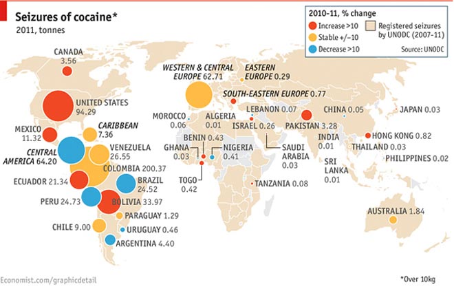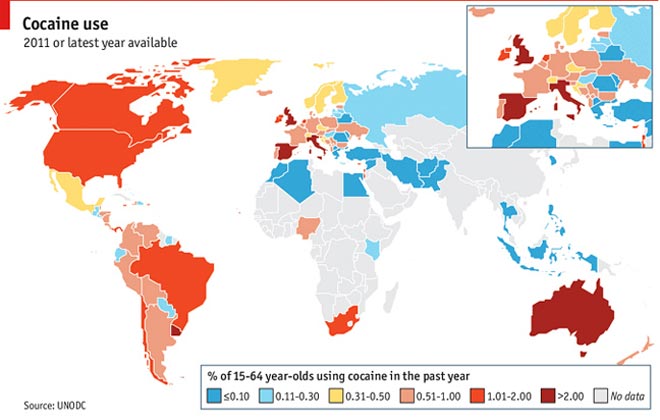 Τον παγκόσμιο χάρτη κατανάλωσης κοκαΐνης παρουσιάζει το βρετανικό περιοδικό Economist, με αφορμή τη σύλληψη του περιβόητου έμπορου ναρκωτικών Joaquín «Shorty» Guzmán στο Μεξικό.
