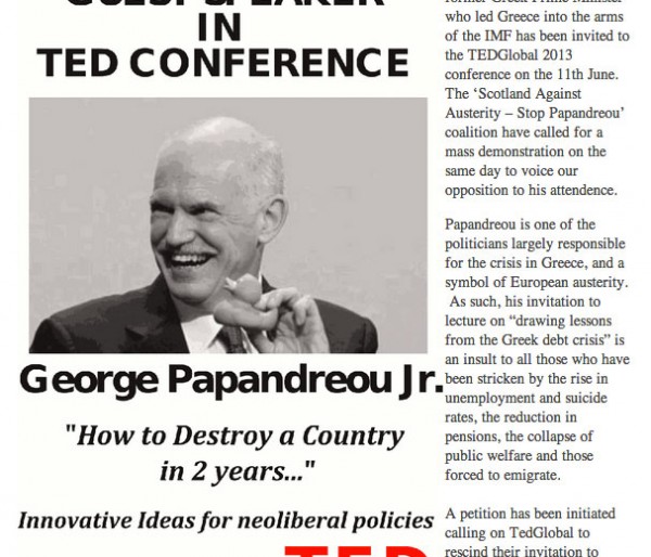 «Θερμή υποδοχή» επιφύλαξαν στον Γιώργο Παπανδρέου οι διαδηλωτές που συγκεντρώθηκαν έξω από το μέγαρο του Εδιμβούργου, στο οποίο βρίσκεται σε εξέλιξη το συνέδριο TEDGlobal.